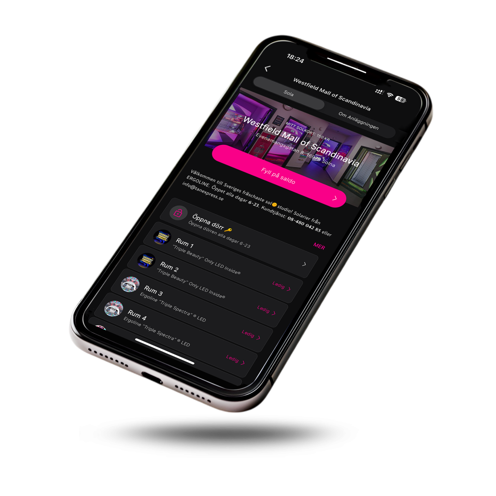 När du sedan vill sola och ser att ett rum är ledigt, så klickar du bara på det rummet i appen. Betala sedan enkelt genom att följa instruktionerna i appen.